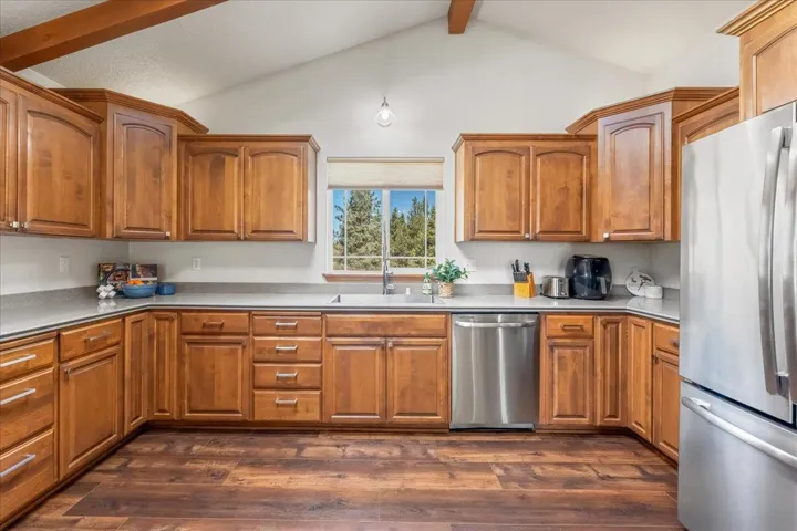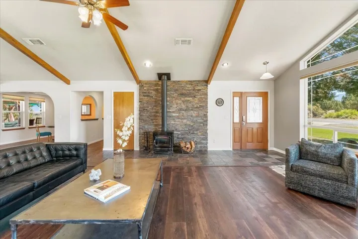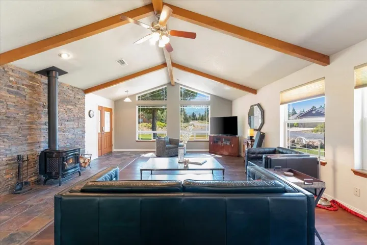 Stunning custom home w/ views of majestic Mt. Shasta has it all! Three spacious bedrooms, an office, two full bathrooms, utility room, attached 2+ car garage and a separate 600 SF ADU/Studio plus flexible space for art or home gym. Step inside to an open light filled living room with soaring vaulted ceilings, beautiful exposed beams, luxury laminate wood flooring & gorgeous view of Mt Shasta. The kitchen, designed for those who love to cook and entertain, is a culinary dream w/ alder cabinets, stainless steel appliances, an eat-in bar & abundant counter space & separate dining area, adorned with elegant archways.The large primary en suite is a true retreat, featuring a private door to the backyard patio, double sinks, and a spacious walk-in closet. A fully fenced backyard is an outdoor oasis, complete with a pergola, covered porch, fountain, irrigation and lush lawn, ideal for barbecues and stargazing under the clear Lake Shastina skies. This home has been meticulously maintained, reflecting true pride of ownership. With bonus space to park your RV or boat, this property offers both functionality and luxury. Don’t miss the chance to make this exceptional home yours!