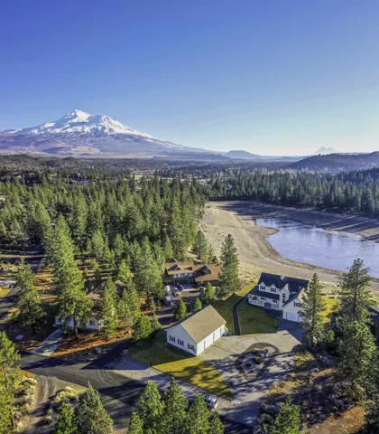 One of a kind home on Lake Shastina with 1200 sq ft shop. This custom home has high end finishes everywhere you look. Walk in to a spacious living room with a double sided fireplace shared with dining room. Remarkable kitchen with lake views. Upstairs you’ll find three spacious bedrooms, two bathrooms, a laundry room, and a bonus room above the attached garage. Enjoy the views from the wrap around deck. Any project is possible with the detached shop with large loft. Property boasts lawn, landscaping, and a paved circle driveway. A must see property.
