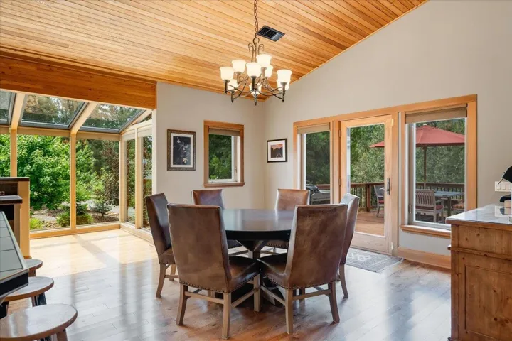 Tucked away on just over five private acres, this exceptional mountain retreat offers space, craftsmanship, and flexibility rarely found. Featuring 6 bedrooms and 3.5 bathrooms, the home is thoughtfully designed for both everyday living and hosting on a grand scale. Vaulted wood ceilings, warm natural finishes, and expansive windows bring the outdoors in, filling the home with light and forest views from nearly every room. The main living area centers around a striking stone fireplace and opens seamlessly to a spacious kitchen with a large island, abundant cabinetry, and quality appliances—perfect for gathering with family and friends. Multiple living spaces provide endless options, including a lower-level bonus room ideal for a media room, game room, or guest quarters. The generous primary suite offers a peaceful retreat with a spa-inspired bathroom and serene mountain views. Outdoor living is just as impressive, featuring expansive decking ideal for entertaining, an orchard and gardening area with a cedar greenhouse, and spaces to simply enjoy the serenity. A three-car attached garage plus a separate two-car shop provide ample room for vehicles, toys, hobbies, or workshop space.