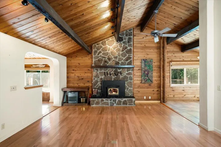 This enchanting retreat is nestled deep in the pines of Mount Shasta, where sunlight dances through the canopy and spills across skylights and wide windows. Inside, the warmth feels almost handcrafted–think exposed beams, soft earth tones, and art that belongs here. If you crave a gentle escape from the rush, this is your sanctuary. The main floor holds the primary suite, living area, dining nook, and kitchen–all flowing together like a quiet conversation. Sliding glass opens to a generous rear deck, framing the towering evergreens and wildflowers that carpet the slope. Downstairs, extra bedrooms wait beside a cozy family room and a sunlit art studio. The big utility space flows right off the office-bedroom, spilling onto terraced steps that wind down to the seasonal creek. New deck off the primary bedroom–perfect for morning coffee with the mountain watching. The salt-water hot tub Tucked under a fresh-covered pergola, steam rising like a secret between the trees.