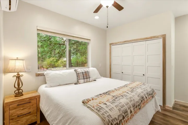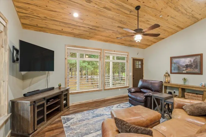 Set among towering pines on a quiet street in the desirable Squaw Creek subdivision, this 2021-built cabin near McCloud offers a perfect blend of modern comfort and mountain charm. Beneath a bold red metal roof, a ¾ wraparound covered deck with recessed lighting and ceiling fans creates an effortless extension of living space—ideal for slow mornings, al fresco dining, and evenings under the stars. Inside, soaring blue pine ceilings draw the eye upward, filling the home with warmth and character. The open-concept living, dining, and kitchen areas flow seamlessly, designed for gathering yet grounded in everyday ease. A custom stone hearth with wood stove anchors the living space, offering that cozy, timeless cabin feel. The kitchen features stainless steel appliances, custom cabinetry, subway tile backsplash, and generous prep space. Bedrooms include blue pine accents and ceiling fans, while two full bathrooms provide comfort and functionality. Mini splits for efficient heating and cooling, a tankless water heater, fire suppression system & a large utility room. Whether a weekend escape or full-time haven, this property embodies the rhythm and beauty of mountain living.