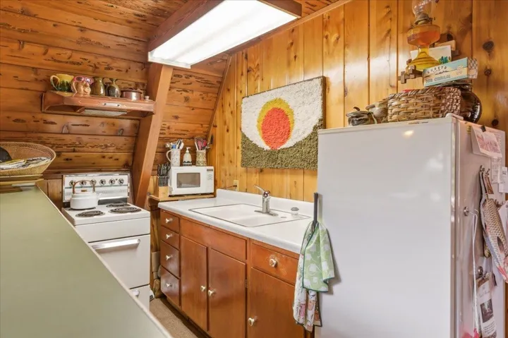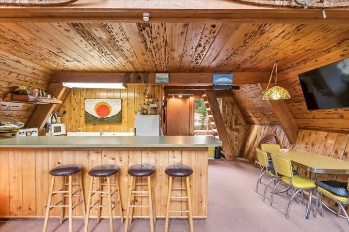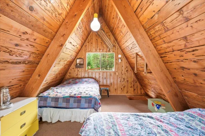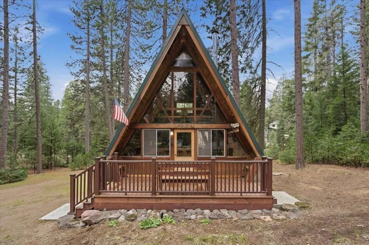Tucked among the pines on a peaceful one-acre setting just minutes from town, this unique cedar plank A-frame cabin tells a story of generations past and possibilities ahead. Built in 1968 and lovingly held by one family as a vacation retreat for decades, it now offers a rare opportunity for new owners to carry on its legacy. Set on a quiet street with space to breathe, the property features a sunny garden area, perfect for planting, relaxing, and enjoying the seasons. A welcoming Trex front deck invites slow mornings and starlit evenings. Inside, the classic A-frame design showcases soaring lines and natural light, with a new wood stove adding warmth and timeless cabin charm. A cozy sleeping loft, accessed by ladder, enhances the authentic, rustic feel. Recent improvements include a newer metal roof and EV charger, blending convenience with mountain living. The home is on well and septic and is being sold as-is—ready for updates and a fresh vision. Whether you’re dreaming of a weekend escape or a full-time retreat, this cabin is ready for its next chapter.